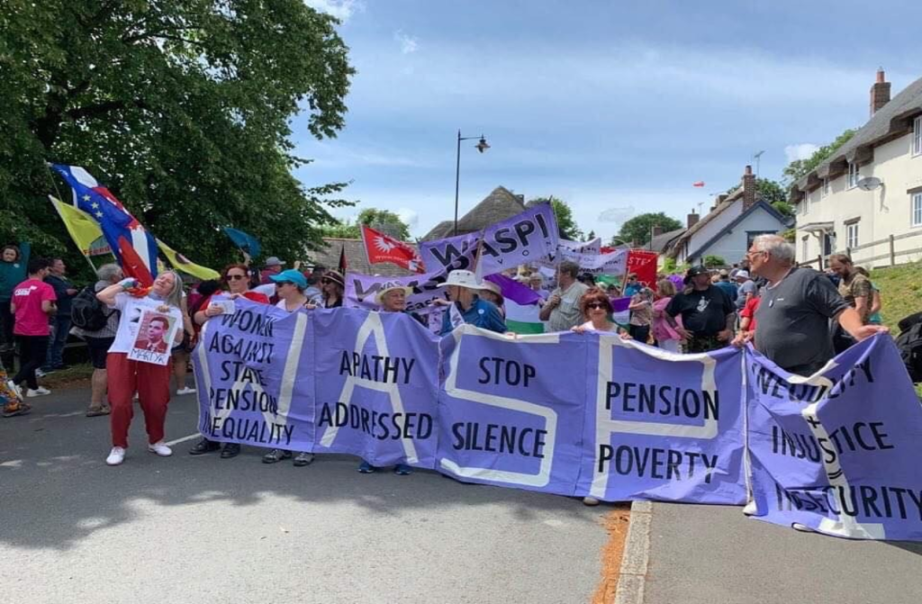 The project was different from the events demonstrations and lobbying that we had been doing. It was great for building confidence amongst our members – no-one had ever been involved in anything “artistic” before, those who attended learned new skills and were gifted with print resources to carry on making art. The project was seen as politically neutral so media who were uneasy about featuring WASPI in normal circumstances were happy to show the campaign in a positive light Even group members who were not involved with WASPI at the time of the project take great delight in marching behind the banner. The project also raised the profile of the local group within WASPI with a feature in the Member’s Newsletter and in national social media outlets. Photo 1 shows the banner in action with members (and their husbands and partners) from across the country marching with and behind it at the Tolpuddle Martyrs Festival. Image by Valerie French.